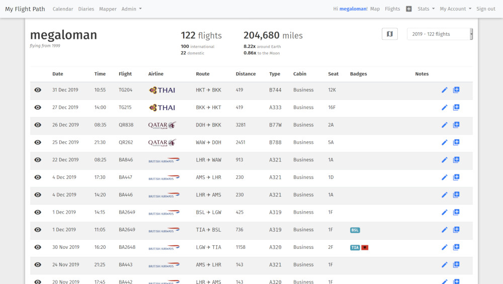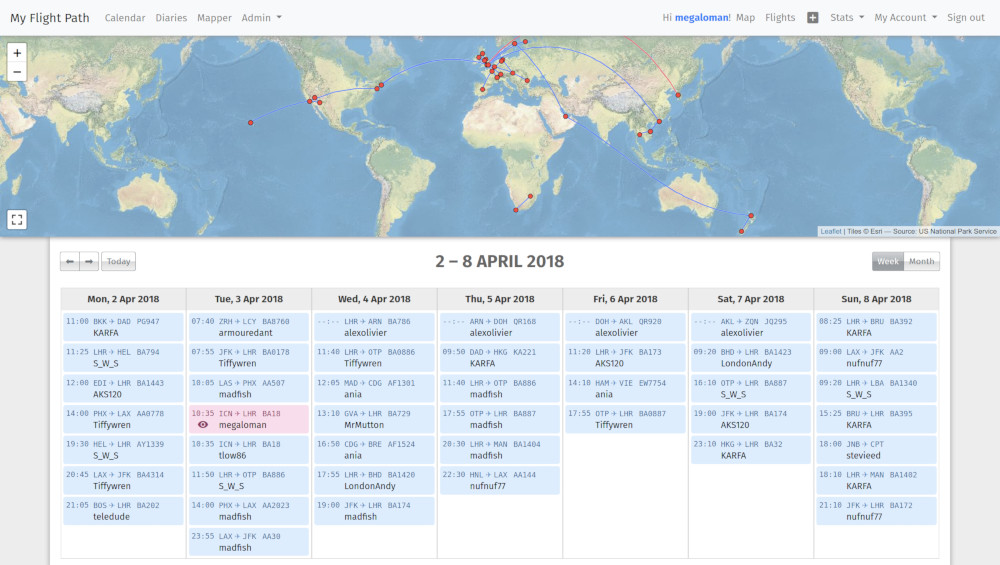 Welcome to My Flight Path – a simple place to record all your flights, browse other travellers' diaries, visualise travel maps, and check your detailed travel stats.