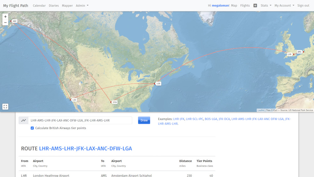 Simple great circle mapper which lets you calculate miles flown and British Airways Executive Club tier points.